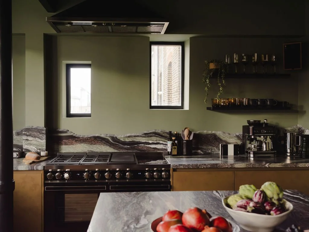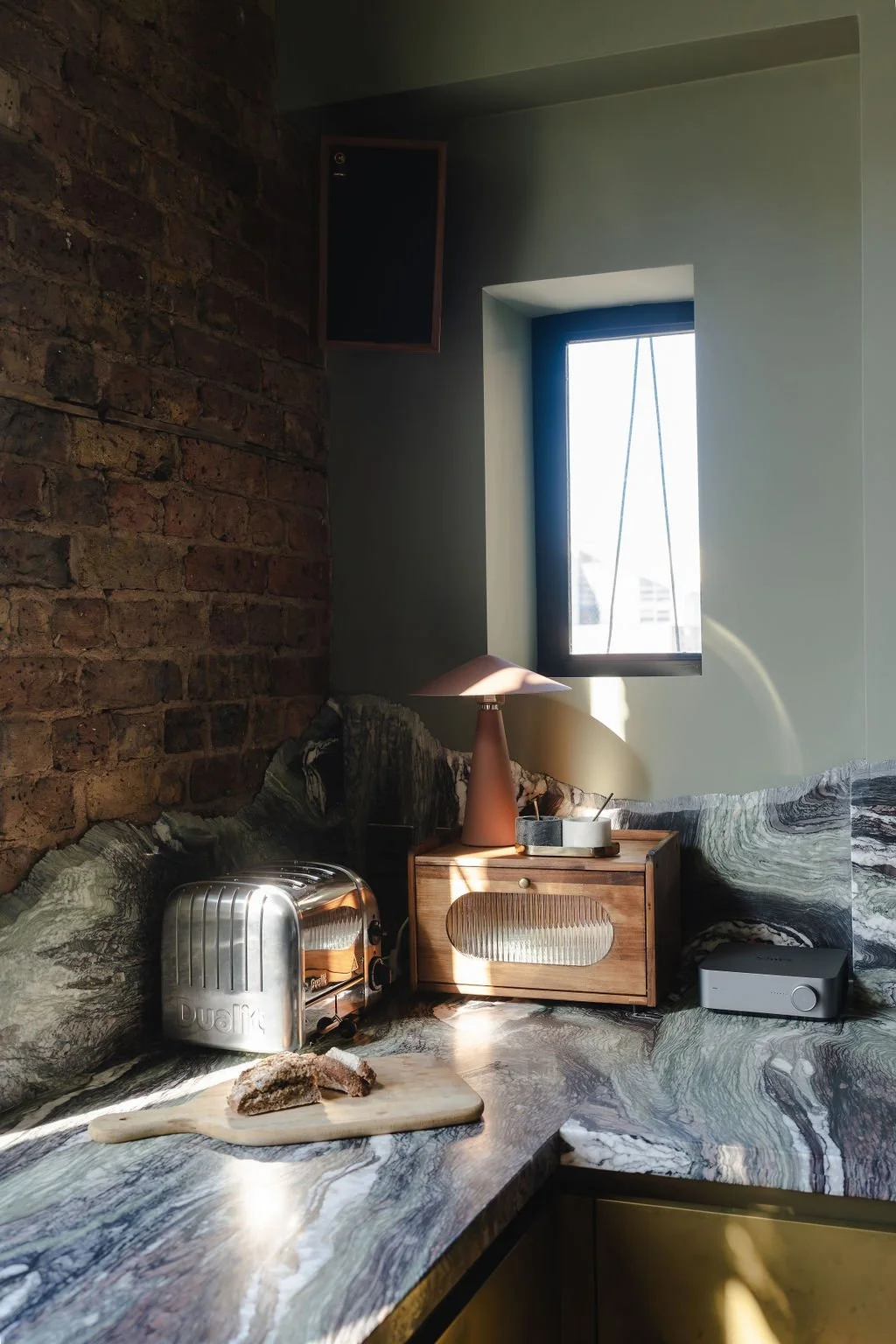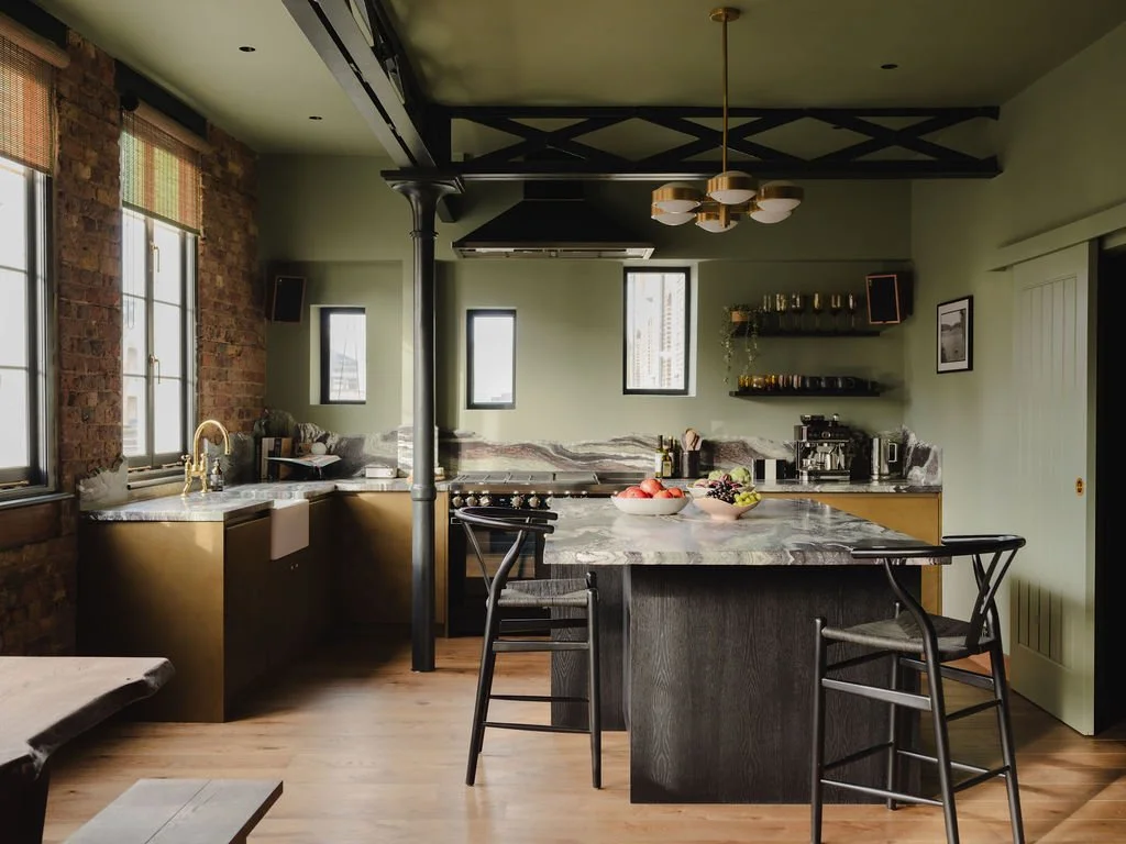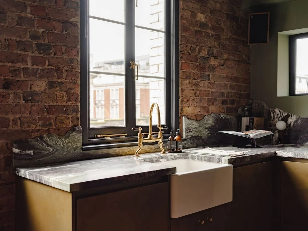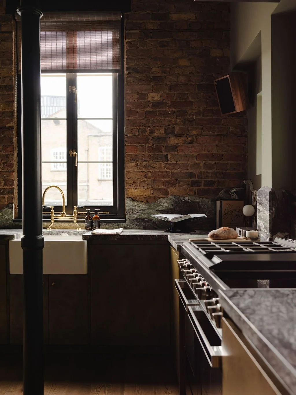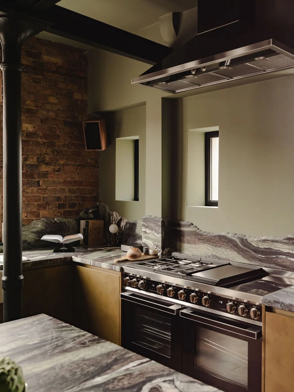 The kitchen, a striking focal point, features our custom-designed backsplash with a raw, organic-edged detail in Italian Luana Rosso marble, enhancing the home’s industrial authenticity while adding a touch of refined craftsmanship.