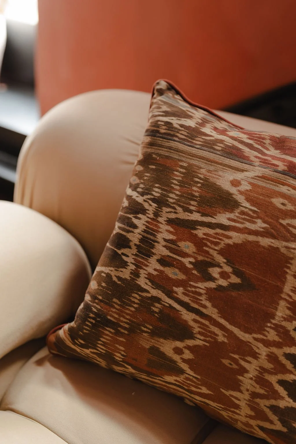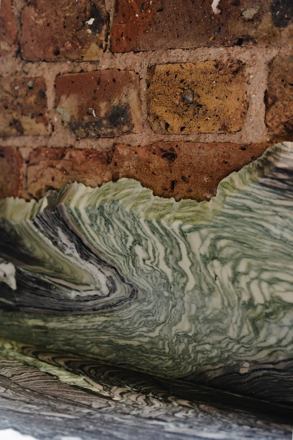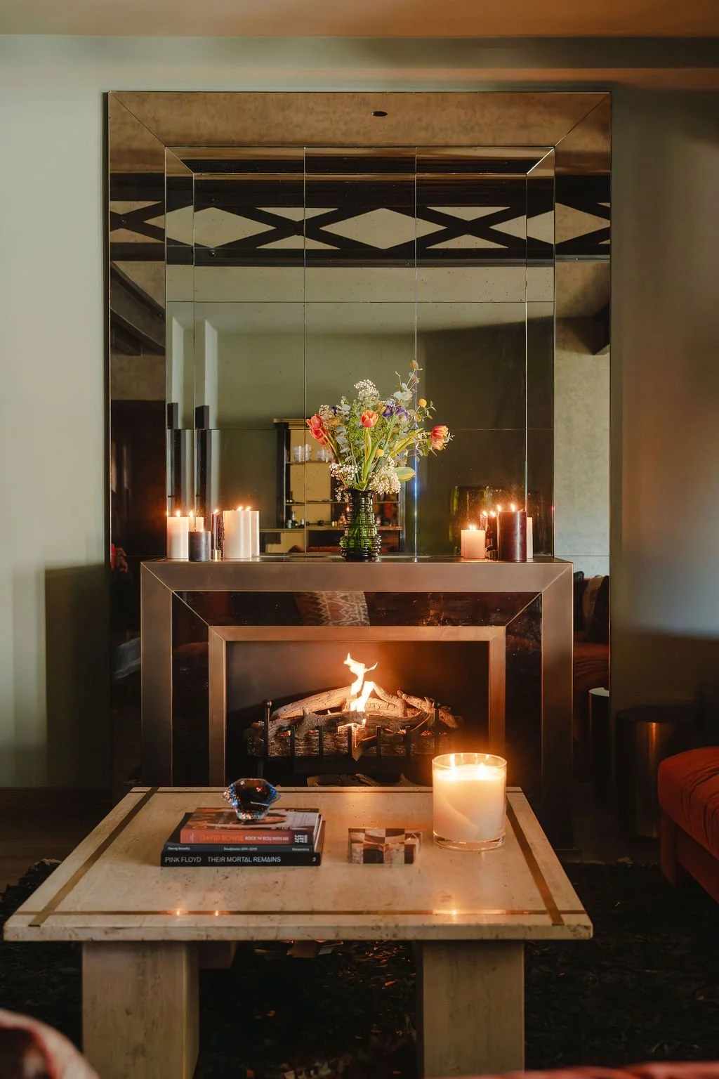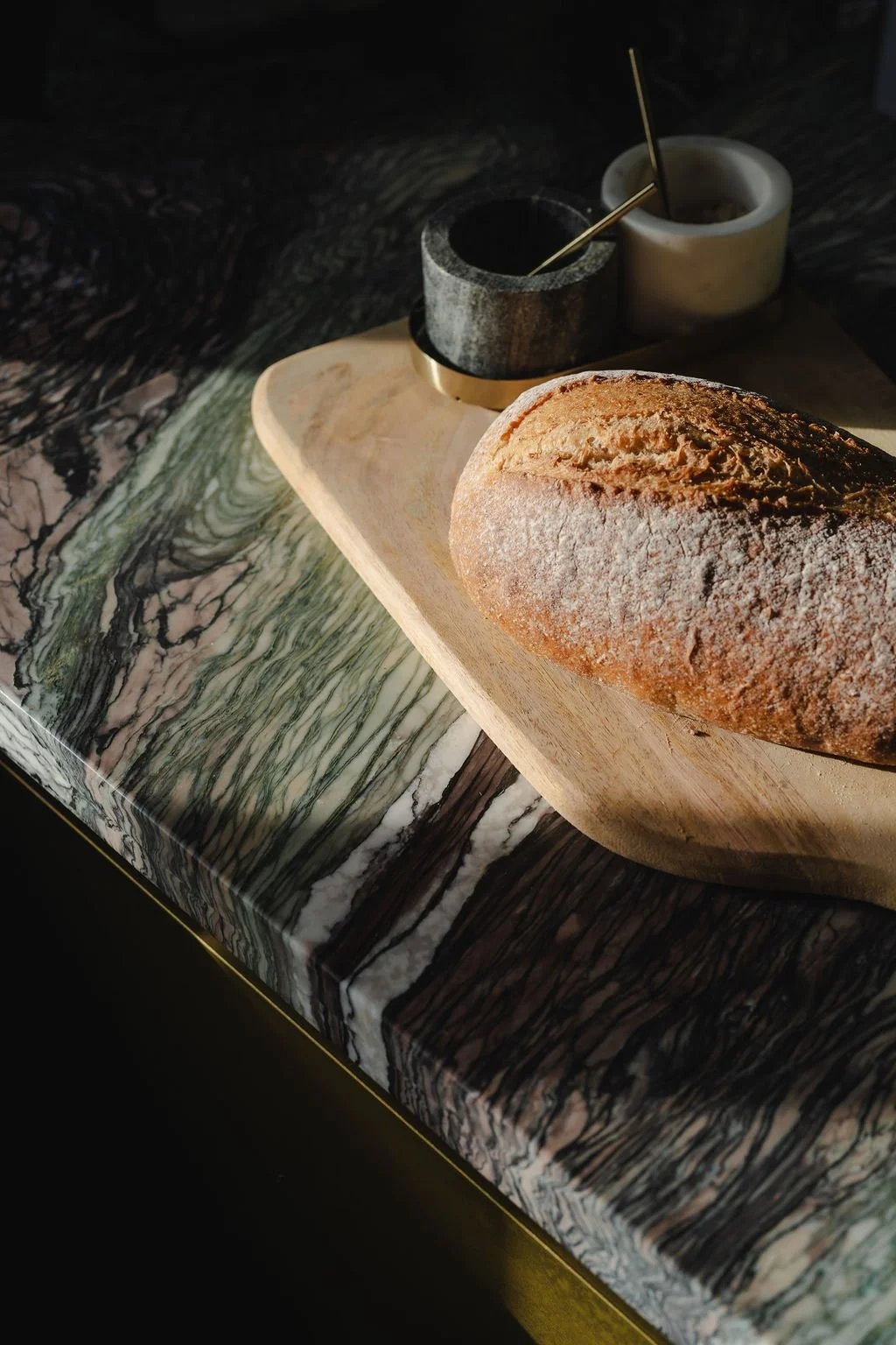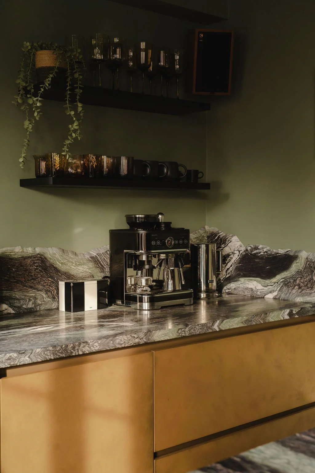 The kitchen, a striking focal point, features our custom-designed backsplash with a raw, organic-edged detail in Italian Luana Rosso marble, enhancing the home’s industrial authenticity while adding a touch of refined craftsmanship.