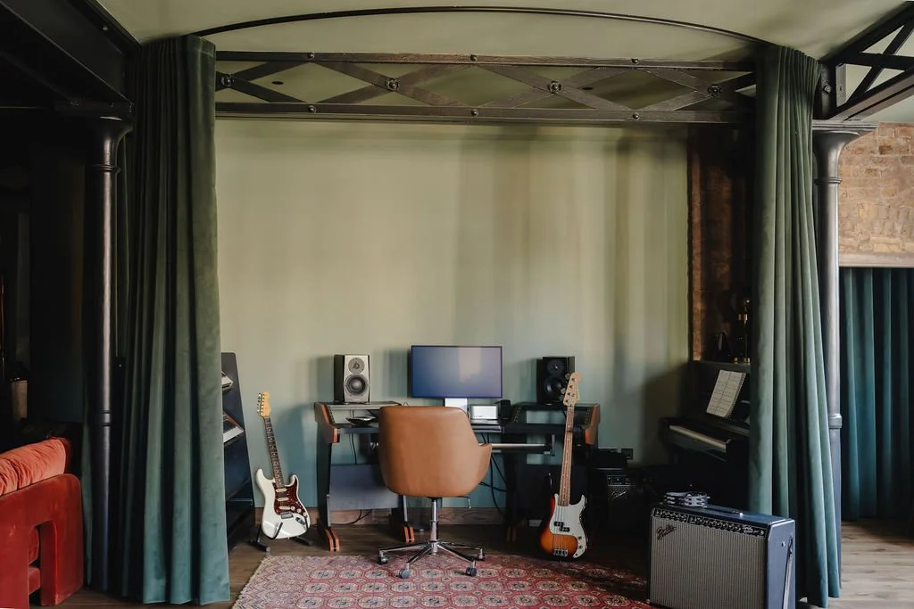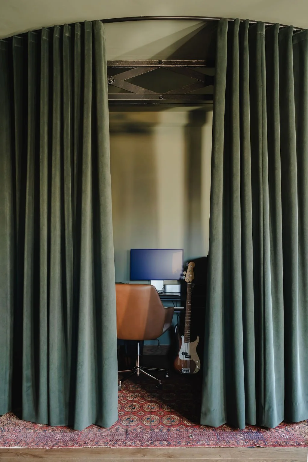 A key requirement was the seamless integration of a music studio within the living space. This was accomplished through the strategic use of an acoustic perimeter curtain, offering both flexibility and sound control.