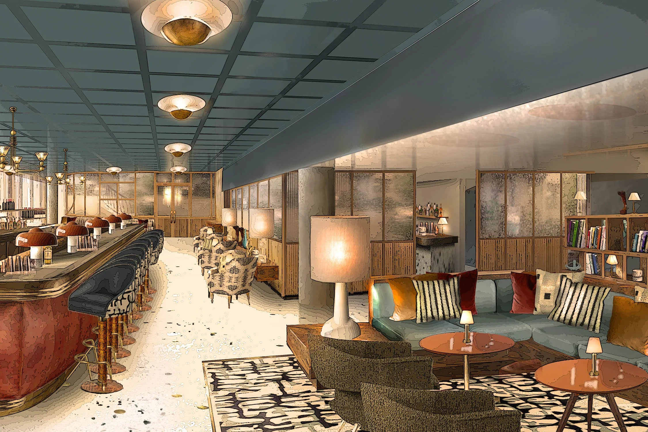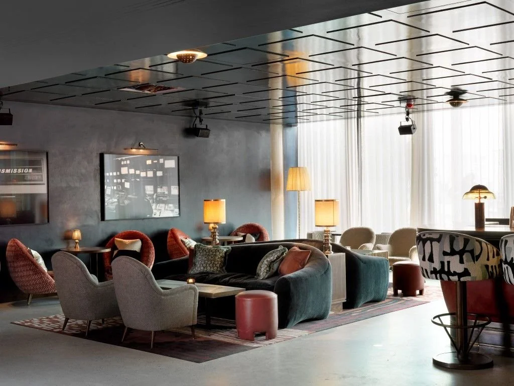 Soho House's White City House, located within the former BBC Television Centre in West London, was designed to thoughtfully blend the building's mid-century heritage with contemporary aesthetics. The interiors pay homage to the 1960s, featuring fluted timber walls inspired by the original BBC reception area, terrazzo flooring, and period-appropriate furniture. Fabrics by Tibor, a designer who once created patterns for the BBC, further enhance the retro-chic ambience.