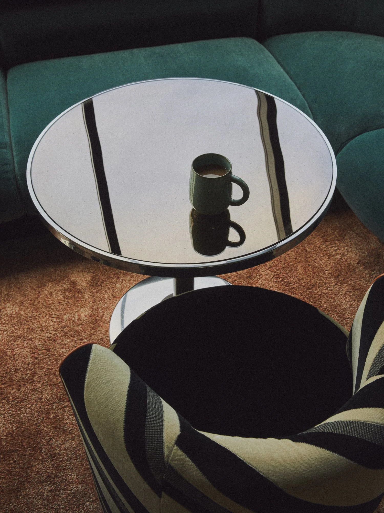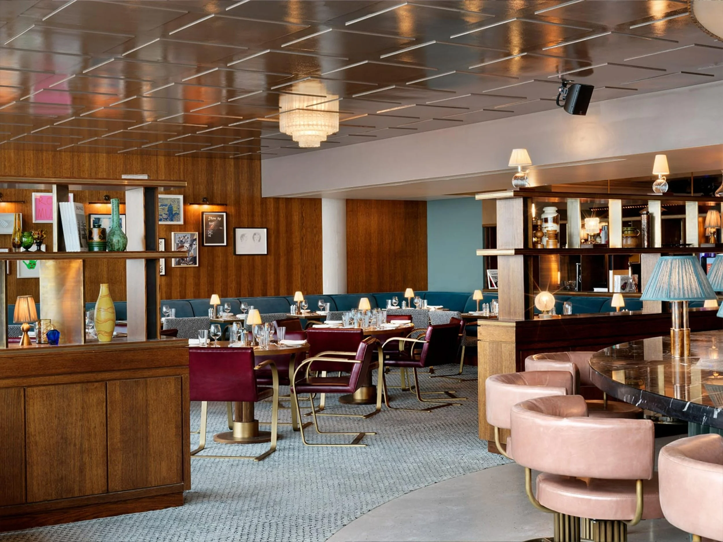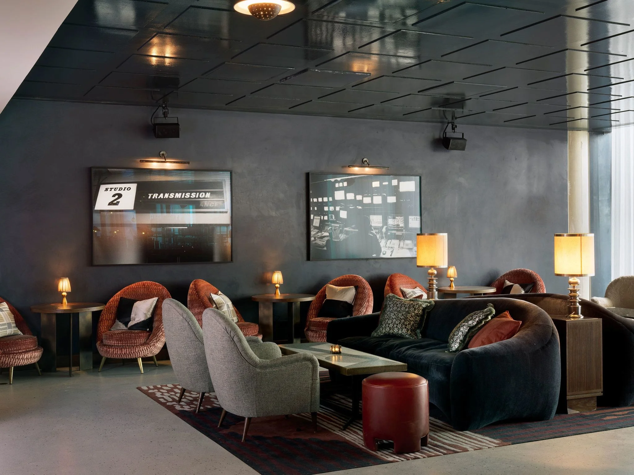 The members' lounge on the ninth floor exemplifies this design approach, with blue banquettes and red leather chairs with brass legs emphasiSing the retro vibe. We designed terrazzo flooring, inset with brass, to run throughout the floor, and a test-card rug pays homage to the building's broadcasting heritage.